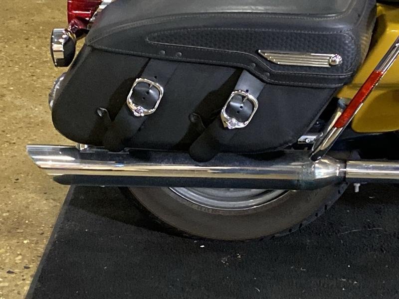 • Nostalgic leather-wrapped hard saddlebags and tooled leather seat; wide whitewall tires and laced wheels; large hiawatha headlamp and chrome nacelle; detachable windshield; cruise control; air-adjustable rear suspension; Brembo® brakes