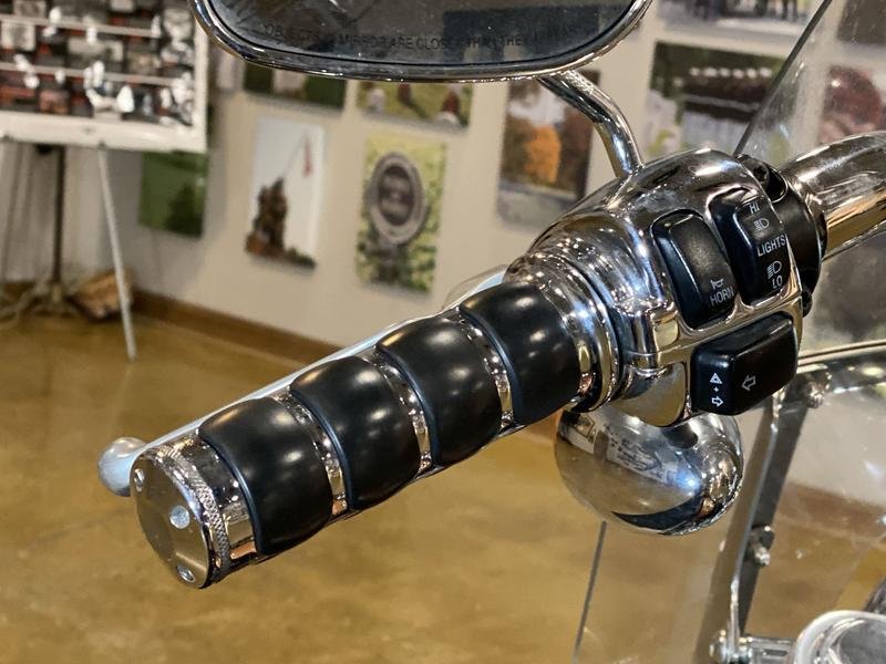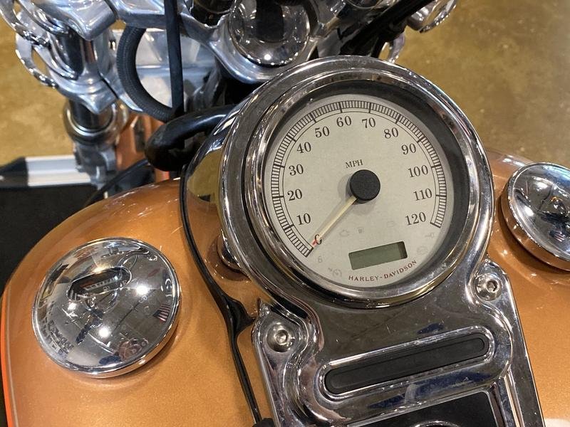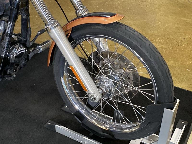 - Wide, raked-out front fork(34°) with 49mm fork tubes; 1-¼” ape-hanger handlebar internally wired (clean front-end look); bobtail fender; stepped, chopper seat; forward-mounted foot controls; 21-in. laced front wheel; large, tank-mounted speedometer; for 2008, presented in serialized, limited-edition 105th Anniversary styling